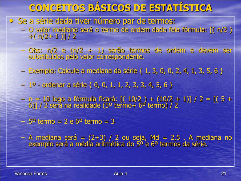 CONCEITOS BÁSICOS DE ESTATÍSTICA • Se a série dada tiver número par de termos: • O valor mediano será o termo de ordem dado fela fórmula: [( n/2 ) +( n/2+ 1 )] / 2 • Obs: n/2 e (n/2 + 1) serão termos de ordem e devem ser substituídos pelo valor correspondente. • Exemplo: Calcule a mediana da série { 1, 3, 0, 0, 2, 4, 1, 3, 5, 6 } • 1º - ordenar a série { 0, 0, 1, 1, 2, 3, 3, 4, 5, 6 } • n = 10 logo a fórmula ficará: [( 10/2 ) + (10/2 + 1)] / 2 = [( 5 + 6)] / 2 será na realidade (5º termo+ 6º termo) / 2 • 5º termo = 2 e 6º termo = 3 • A mediana será = (2+3) / 2 ou seja, Md = 2,5 . A mediana no exemplo será a média aritmética do 5º e 6º termos da série. Aula 4