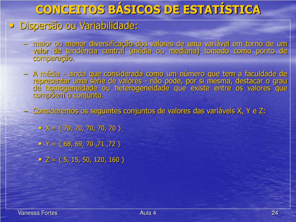 CONCEITOS BÁSICOS DE ESTATÍSTICA • Dispersão ou Variabilidade: • maior ou menor diversificação dos valores de uma variável em torno de um valor de tendência central (média ou mediana) tomado como ponto de comparação. • A média - ainda que considerada como um número que tem a faculdade de representar uma série de valores - não pode, por si mesma, destacar o grau de homogeneidade ou heterogeneidade que existe entre os valores que compõem o conjunto. • Consideremos os seguintes conjuntos de valores das variáveis X, Y e Z: • X = { 70, 70, 70, 70, 70 } • Y = { 68, 69, 70 ,71 ,72 } • Z = { 5, 15, 50, 120, 160 } Aula 4