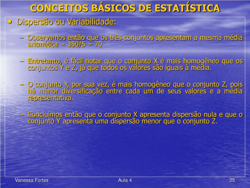 CONCEITOS BÁSICOS DE ESTATÍSTICA • Dispersão ou Variabilidade: • Observamos então que os três conjuntos apresentam a mesma média aritmética = 350/5 = 70 • Entretanto, é fácil notar que o conjunto X é mais homogêneo que os conjuntos Y e Z, já que todos os valores são iguais à média. • O conjunto Y, por sua vez, é mais homogêneo que o conjunto Z, pois há menor diversificação entre cada um de seus valores e a média representativa. • Concluímos então que o conjunto X apresenta dispersão nula e que o conjunto Y apresenta uma dispersão menor que o conjunto Z. Aula 4