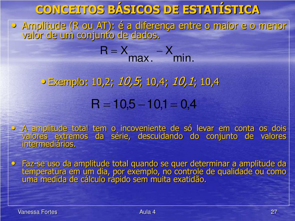 CONCEITOS BÁSICOS DE ESTATÍSTICA • Amplitude (R ou AT): é a diferença entre o maior e o menor valor de um conjunto de dados. • Exemplo: 10,2; 10,5; 10,4; 10,1; 10,4 • A amplitude total tem o incoveniente de só levar em conta os dois valores extremos da série, descuidando do conjunto de valores intermediários. • Faz-se uso da amplitude total quando se quer determinar a amplitude da temperatura em um dia, por exemplo, no controle de qualidade ou como uma medida de cálculo rápido sem muita exatidão. Aula 4