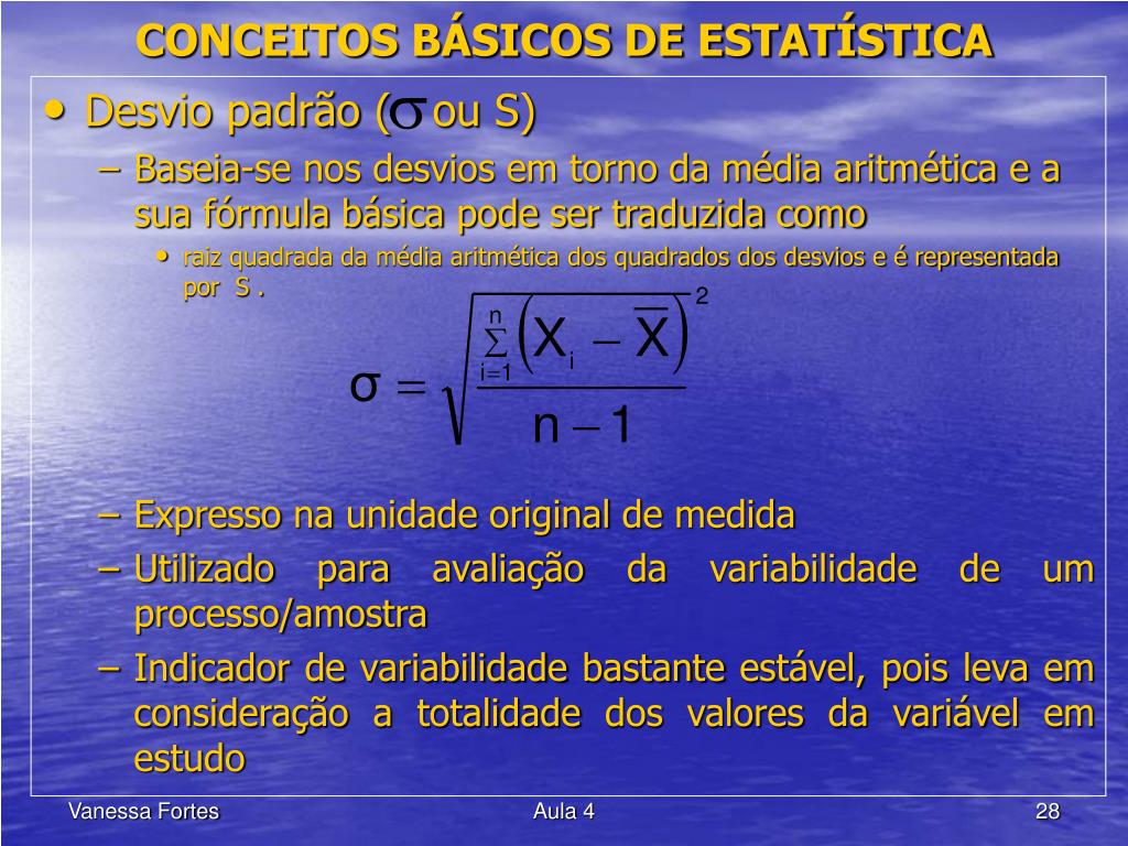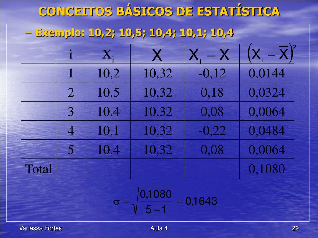 CONCEITOS BÁSICOS DE ESTATÍSTICA • Variância ( ) • Exemplo: 10,2; 10,5; 10,4; 10,1; 10,4 Aula 4