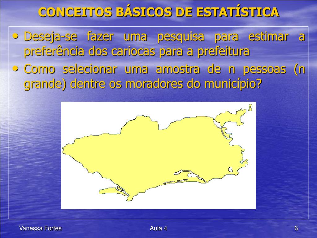 CONCEITOS BÁSICOS DE ESTATÍSTICA • Deseja-se fazer uma pesquisa para estimar a preferência dos cariocas para a prefeitura • Como selecionar uma amostra de n pessoas (n grande) dentre os moradores do município? Aula 4