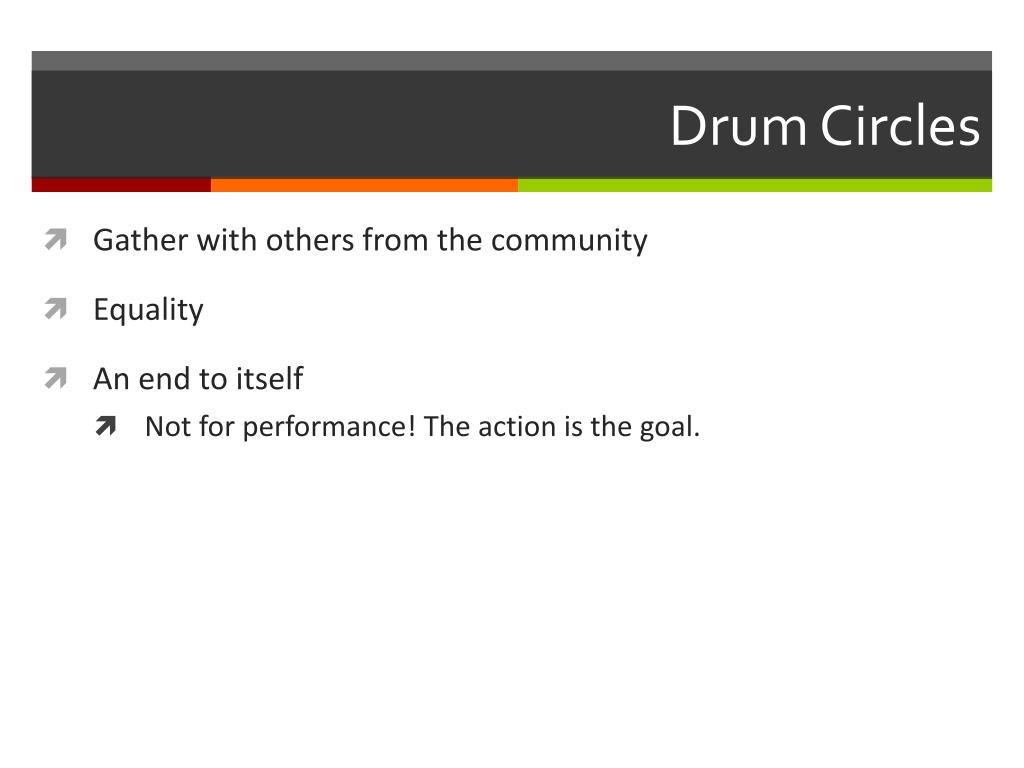 Drum Circles • Gather with others from the community • Equality • An end to itself • Not for performance! The action is the goal.