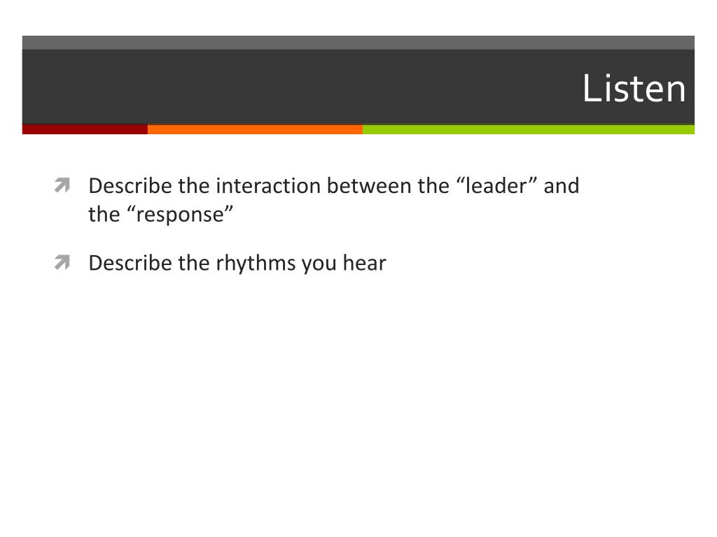 Listen • Describe the interaction between the “leader” and the “response” • Describe the rhythms you hear