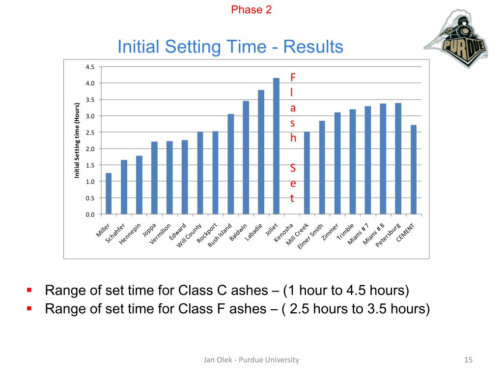 Phase 2 Initial Setting Time - Results Flash Set • Range of set time for Class C ashes – (1 hour to 4.5 hours) • Range of set time for Class F ashes – ( 2.5 hours to 3.5 hours) Jan Olek - Purdue University