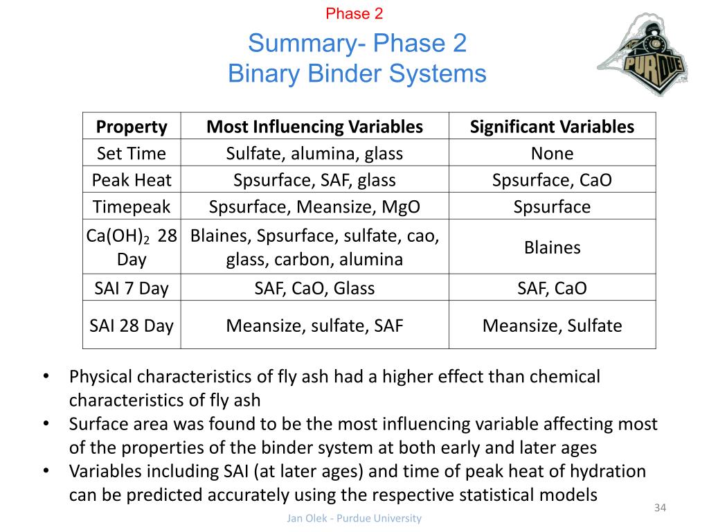 Phase 2 Summary- Phase 2Binary Binder Systems • Physical characteristics of fly ash had a higher effect than chemical characteristics of fly ash • Surface area was found to be the most influencing variable affecting most of the properties of the binder system at both early and later ages • Variables including SAI (at later ages) and time of peak heat of hydration can be predicted accurately using the respective statistical models Jan Olek - Purdue University