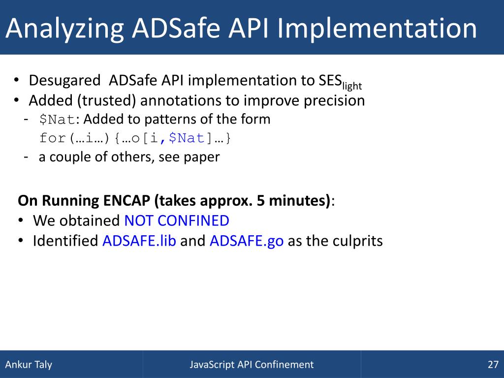 Analyzing ADSafe API Implementation • DesugaredADSafe API implementation to SESlight • Added (trusted) annotations to improve precision • $Nat: Added to patterns of the form • for(…i…){…o[i,$Nat]…} • a couple of others, see paper • On Running ENCAP (takes approx. 5 minutes): • We obtained NOT CONFINED • Identified ADSAFE.lib and ADSAFE.go as the culprits JavaScript API Confinement