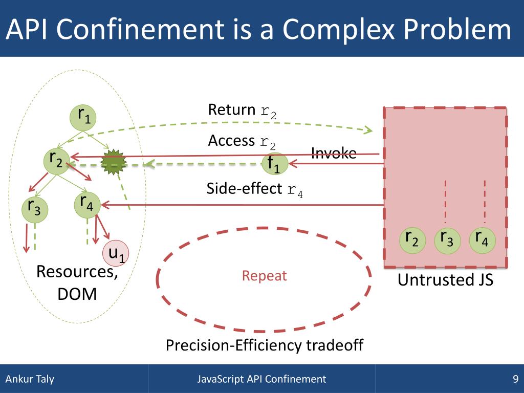 API Confinement is a Complex Problem r1 Return r2 f1 Access r2 Invoke r2 r2 Repeat Side-effect r4 r4 r4 r3 r3 Resources, DOM u1 Untrusted JS Precision-Efficiency tradeoff JavaScript API Confinement