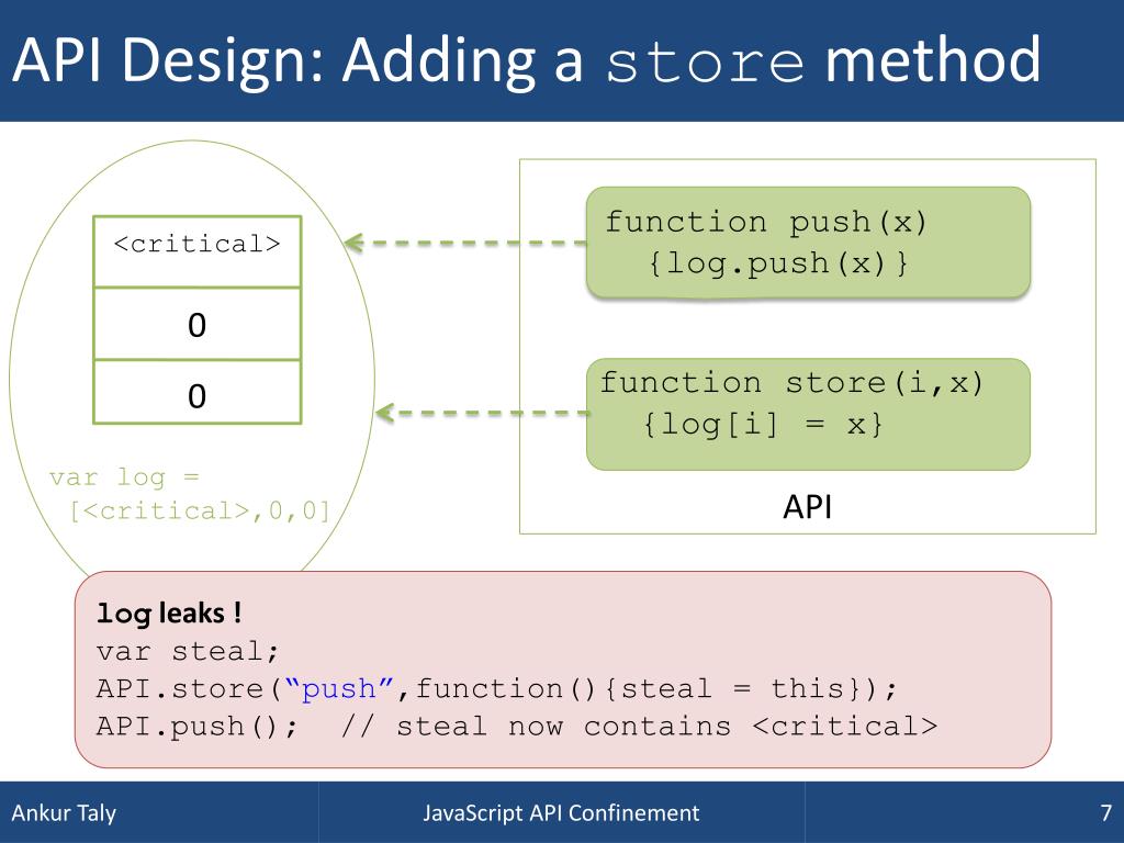 API Design: Adding a store method function push(x) {log.push(x)} <critical> 0 0 function store(i,x) {log[i] = x} API var log = [<critical>,0,0] log leaks ! var steal; API.store(“push”,function(){steal = this}); API.push(); // steal now contains <critical> JavaScript API Confinement