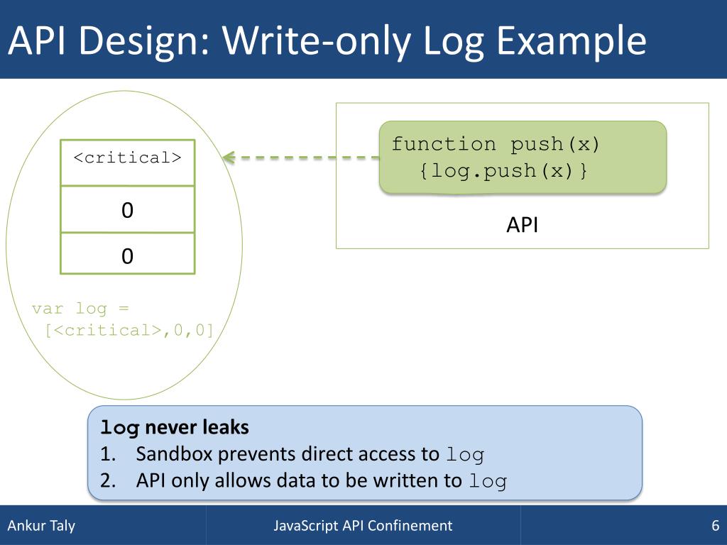 API Design: Write-only Log Example function push(x) {log.push(x)} <critical> API 0 0 var log = [<critical>,0,0] log never leaks Sandbox prevents direct access to log API only allows data to be written to log Untrusted code must only be able to write to log JavaScript API Confinement