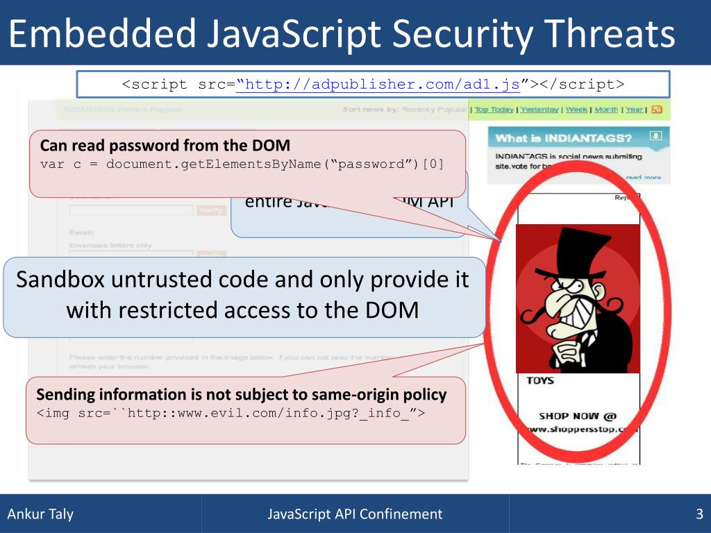 Automated Encapsulation Analysis of Security-Critical APIs. Ankur Taly Stanford University Joint work with Úlfar Erlingsson, John C. Mitchell, Mark S. Miller and Jasvir Nagra. Ankur Taly. Web 2.0 – Webpages with Third-party Code. Lots of client-side JavaScript, AJAX