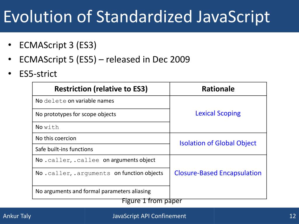 Evolution of Standardized JavaScript • ECMAScript 3 (ES3) • ECMAScript 5 (ES5) – released in Dec 2009 • ES5-strict Lexical Scoping Isolation of Global Object Closure-Based Encapsulation Figure 1 from paper JavaScript API Confinement