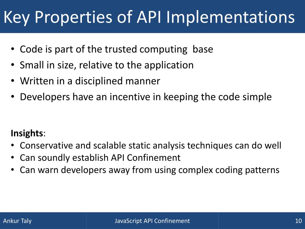 Key Properties of API Implementations • Code is part of the trusted computing base • Small in size, relative to the application • Written in a disciplined manner • Developers have an incentive in keeping the code simple • Insights: • Conservative and scalable static analysis techniques can do well • Can soundly establish API Confinement • Can warn developers away from using complex coding patterns JavaScript API Confinement