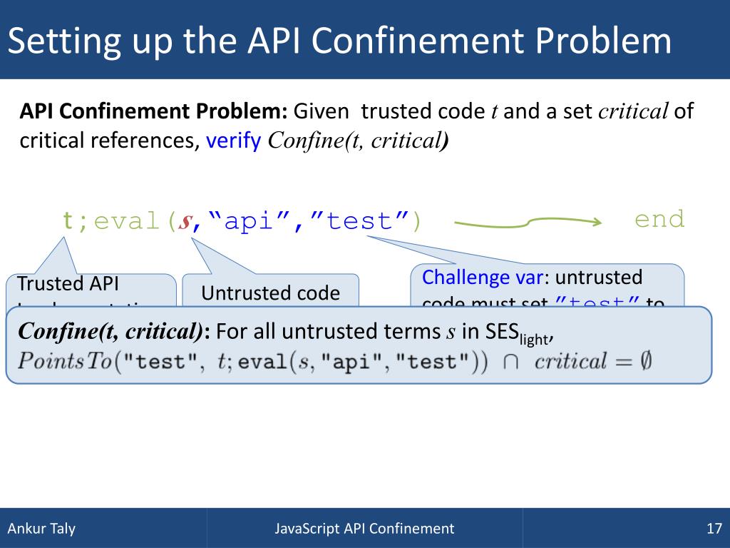 Setting up the API Confinement Problem API Confinement Problem: Given trusted code t and a set critical of critical references, verifyConfine(t, critical) t ;eval(s,“api”,”test”) end Challenge var: untrusted code must set ”test” to a critical reference to win Confine(t, critical): For all untrusted terms s in SESlight, Trusted API Implementation Untrusted code JavaScript API Confinement
