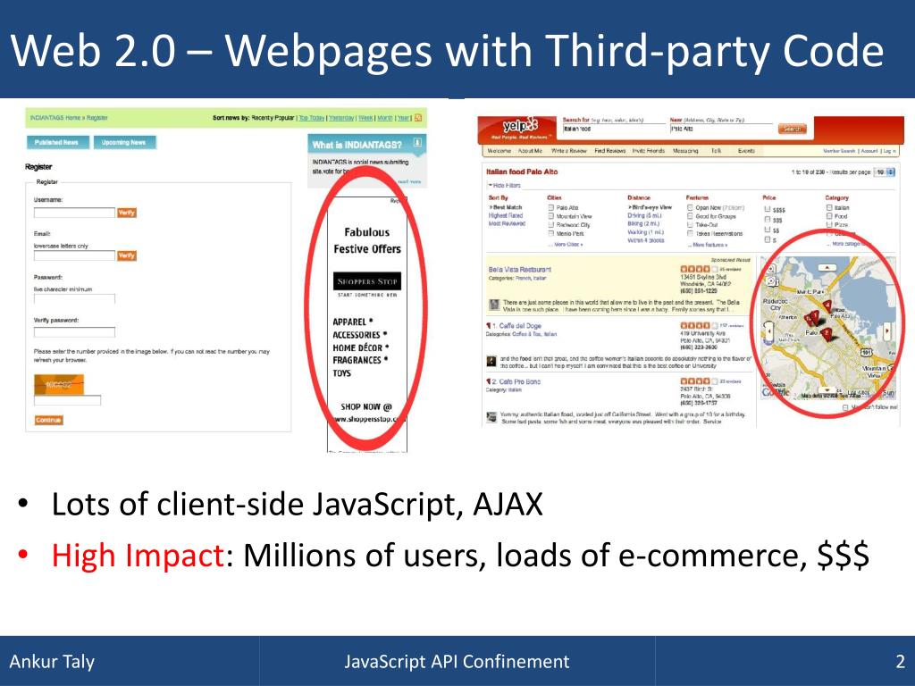 Web 2.0 – Webpages with Third-party Code • Lots of client-side JavaScript, AJAX • High Impact: Millions of users, loads of e-commerce, $$$ JavaScript API Confinement