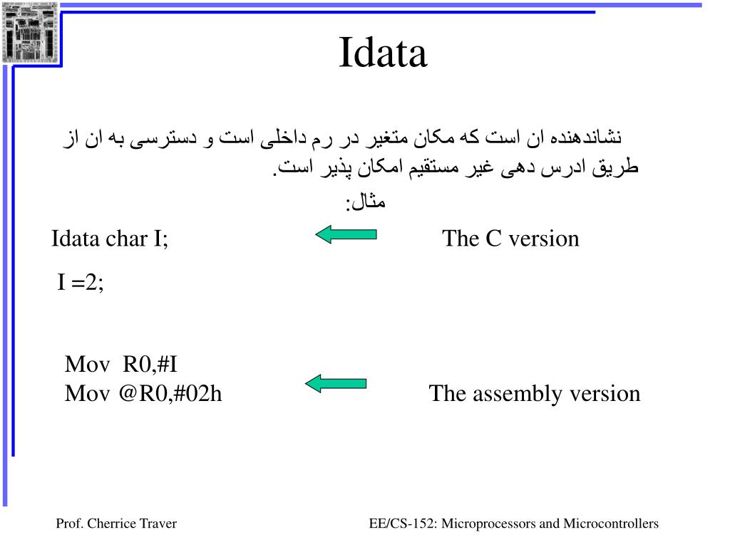Idata نشاندهنده ان است که مکان متغير در رم داخلی است و دسترسی به ان از طريق ادرس دهی غير مستقيم امکان پذير است. مثال: Idata char I; The C version I =2; Mov R0,#I Mov @R0,#02h The assemblyversion EE/CS-152: Microprocessors and Microcontrollers