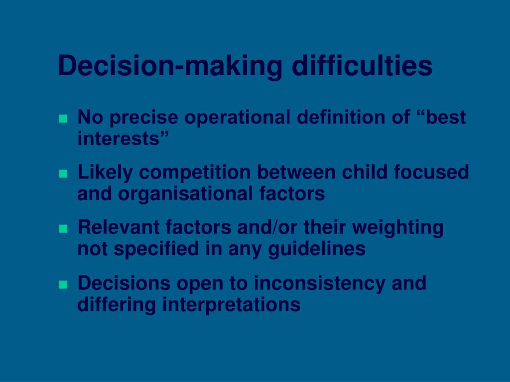 Decision-making difficulties • No precise operational definition of “best interests” • Likely competition between child focused and organisational factors • Relevant factors and/or their weighting not specified in any guidelines • Decisions open to inconsistency and differing interpretations