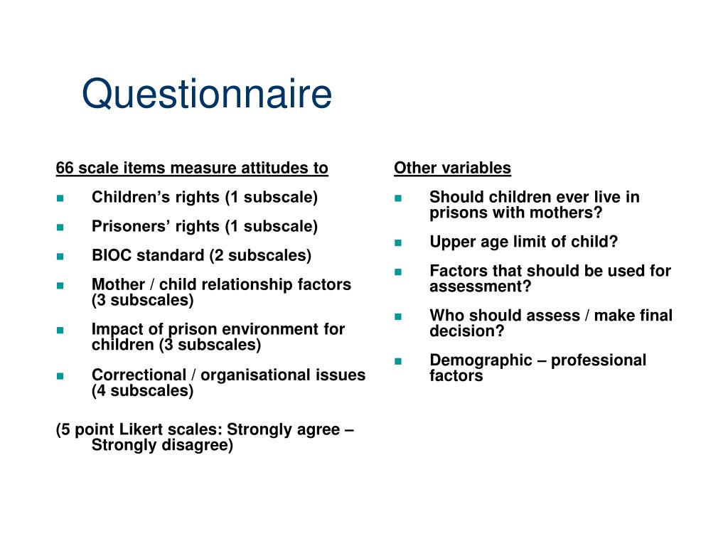 66 scale items measure attitudes to Children’s rights (1 subscale) Prisoners’ rights (1 subscale) BIOC standard (2 subscales) Mother / child relationship factors (3 subscales) Impact of prison environment for children (3 subscales) Correctional / organisational issues (4 subscales) (5 point Likert scales: Strongly agree – Strongly disagree) Other variables Should children ever live in prisons with mothers? Upper age limit of child? Factors that should be used for assessment? Who should assess / make final decision? Demographic – professional factors Questionnaire