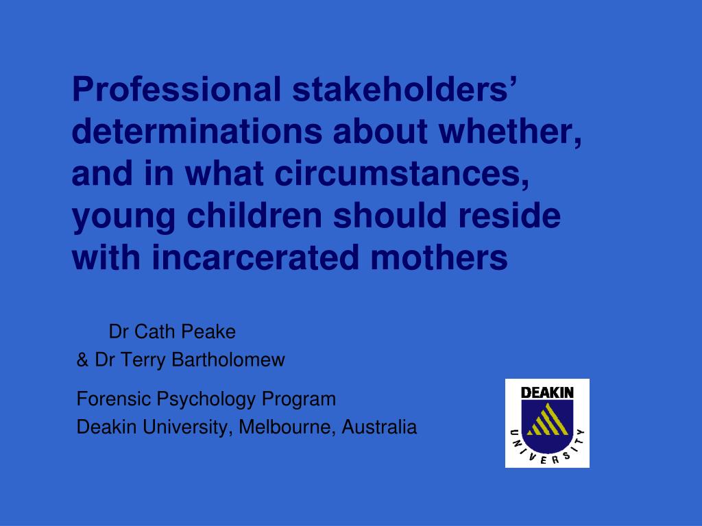 Professional stakeholders’ determinations about whether, and in what circumstances, young children should reside with incarcerated mothers Dr Cath Peake & Dr Terry Bartholomew Forensic Psychology Program Deakin University, Melbourne, Australia