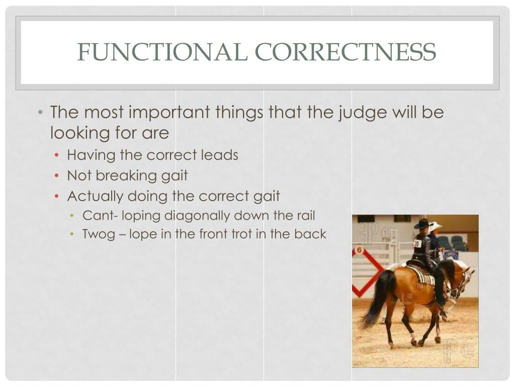 Functional Correctness • The most important things that the judge will be looking for are • Having the correct leads • Not breaking gait • Actually doing the correct gait • Cant- loping diagonally down the rail • Twog – lope in the front trot in the back
