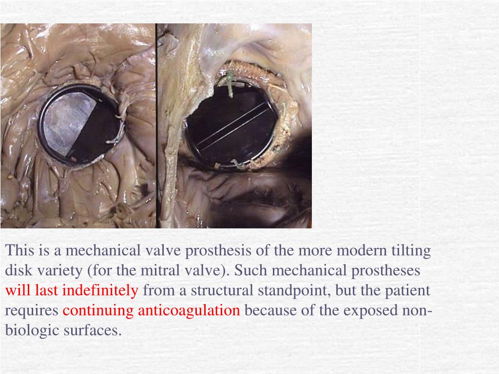 This is a mechanical valve prosthesis of the more modern tilting disk variety (for the mitral valve). Such mechanical prostheses will last indefinitely from a structural standpoint, but the patient requires continuing anticoagulation because of the exposed non-biologic surfaces.