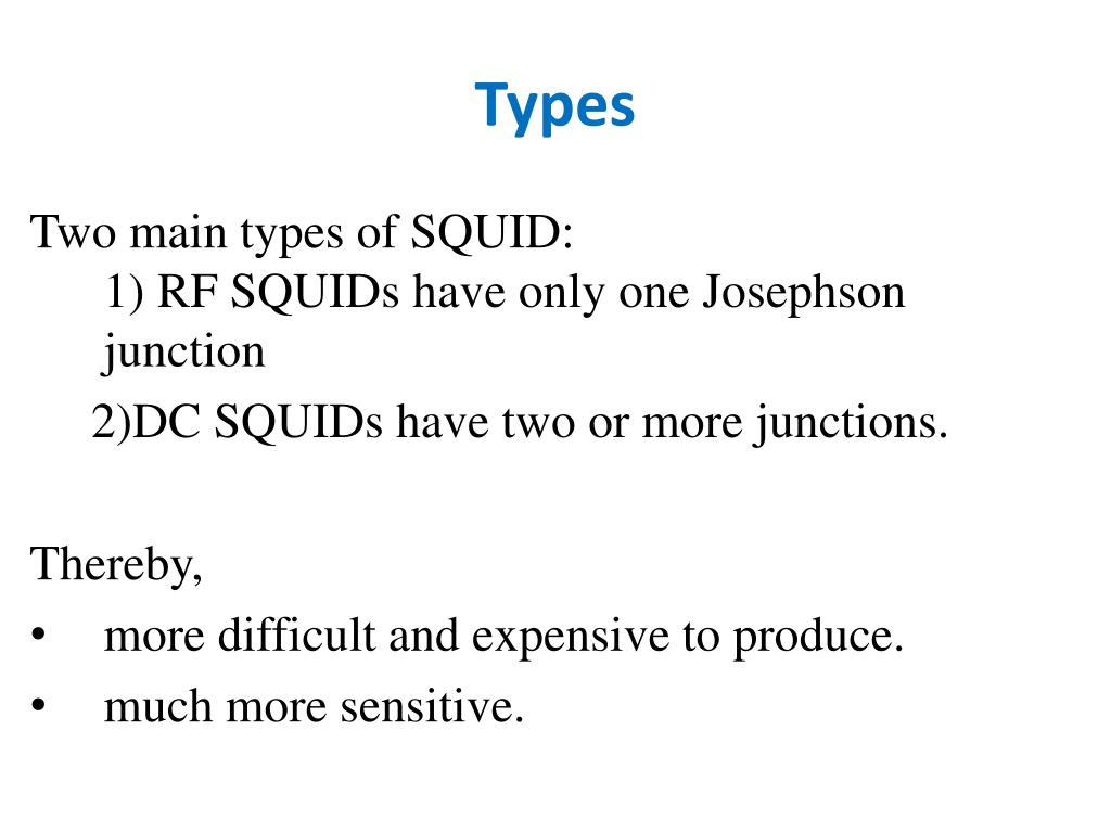 Types Two main types of SQUID: 1) RF SQUIDs have only one Josephson junction 2)DC SQUIDs have two or more junctions. Thereby, • more difficult and expensive to produce. • much more sensitive.