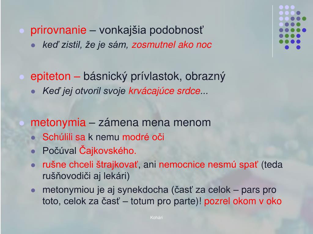 Básnické prostriedky- trópy • obrazné, spravidla zjemnené vyjadrenia, nepriame pomenovania • metafora – vlastnosť veci na inú vec/človeka Od bolesti sa zlomilav páse a v hlase mu zacinkotal úsmev • zdrobnenina Zažiarili detské očičká pod stromčekom bola mačička • personifikácia – zosobnenie, vlastnosť človeka získaná neživou vecou • V tej chvíli ho oslovila nádej Kohári