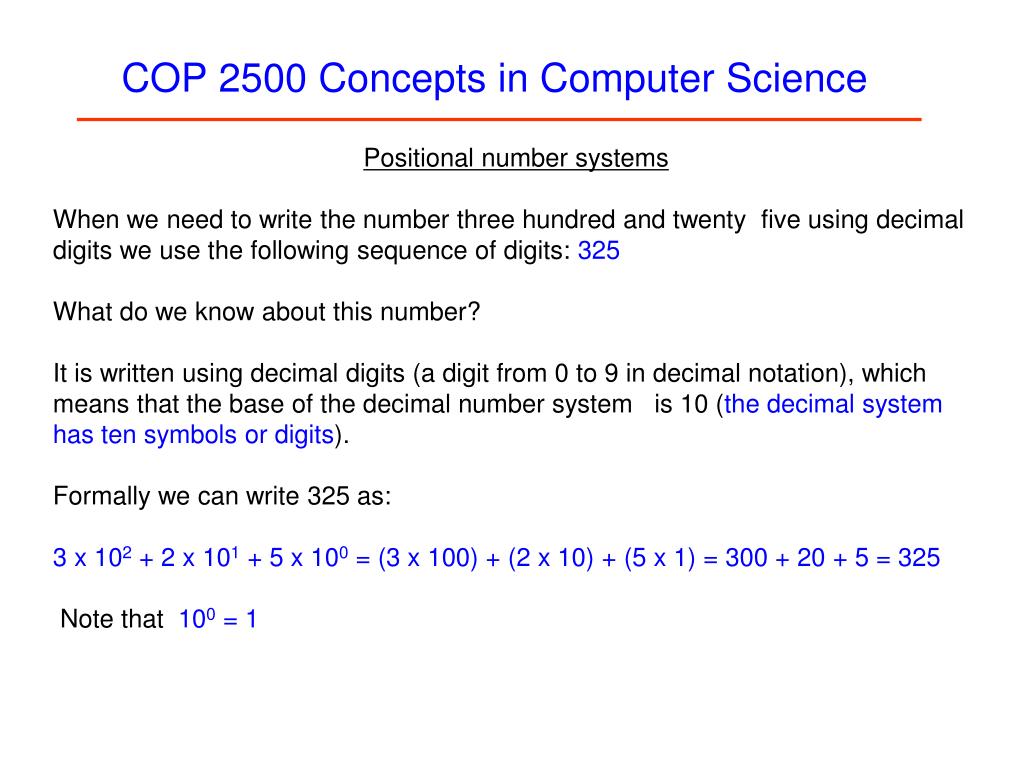 Positional number systems When we need to write the number three hundred and twenty five using decimal digits we use the following sequence of digits: 325 What do we know about this number? It is written using decimal digits (a digit from 0 to 9 in decimal notation), which means that the base of the decimal number system is 10 (the decimal system has ten symbols or digits). Formally we can write 325 as: 3 x 102 + 2 x 101 + 5 x 100 = (3 x 100) + (2 x 10) + (5 x 1) = 300 + 20 + 5 = 325 Note that 100 = 1 COP 2500 Concepts in Computer Science
