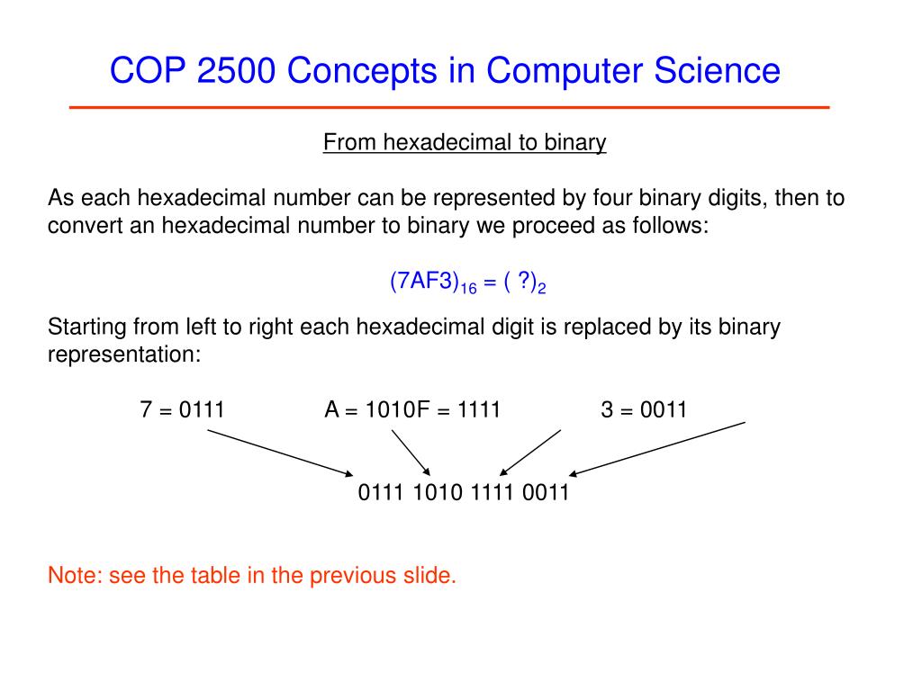 From binary to hexadecimal We need to convert the following binary number to hexadecimal: (10111110111000)2 = ( ?)16 Starting from right to left we make groups of four bits. If the last group on the right has less than four bits we add some padding zeros. 10111110111000 0010 1111 1011 1000 2FB8 COP 2500 Concepts in Computer Science