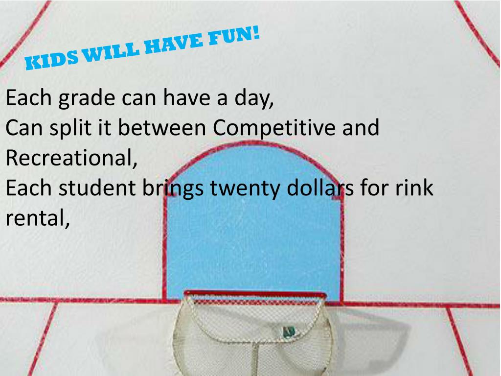 KIDS WILL HAVE FUN! Each grade can have a day, Can split it between Competitive and Recreational, Each student brings twenty dollars for rink rental,