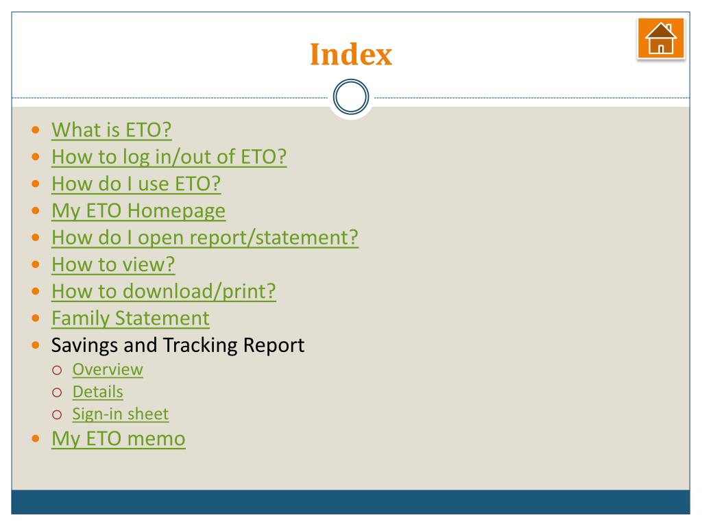 Index • What is ETO? • How to log in/out of ETO? • How do I use ETO? • My ETO Homepage • How do I open report/statement? • How to view? • How to download/print? • Family Statement • Savings and Tracking Report • Overview • Details • Sign-in sheet • My ETO memo
