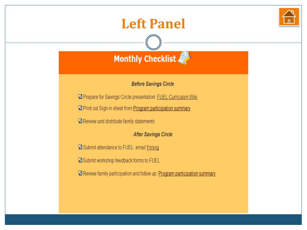 How do I use ETO? • Once you log in, look for HOME PAGE on your top right • You will be able to see the home page of your program: • Monthly Savings Circle checklist • Other programming tools • Report and statement