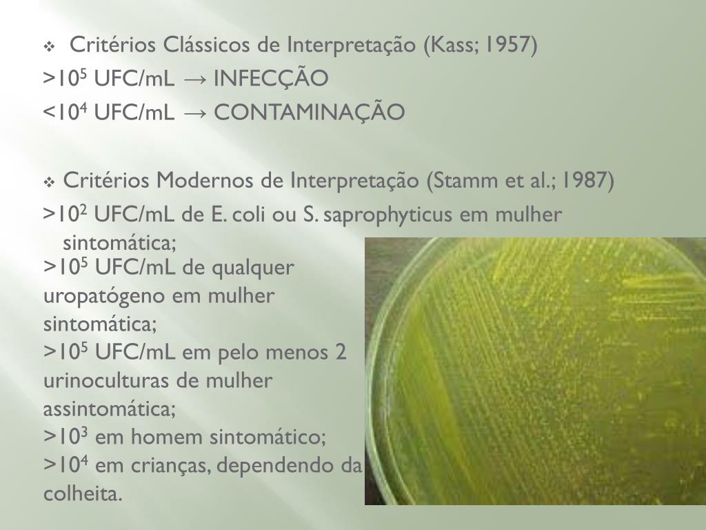 Critérios Clássicos de Interpretação (Kass; 1957) >105 UFC/mL → INFECÇÃO <104 UFC/mL → CONTAMINAÇÃO • Critérios Modernos de Interpretação (Stamm et al.; 1987) >102 UFC/mL de E. coli ou S. saprophyticus em mulher sintomática; >105 UFC/mL de qualquer uropatógeno em mulher sintomática; >105 UFC/mL em pelo menos 2 urinoculturas de mulher assintomática; >103 em homem sintomático; >104 em crianças, dependendo da colheita.