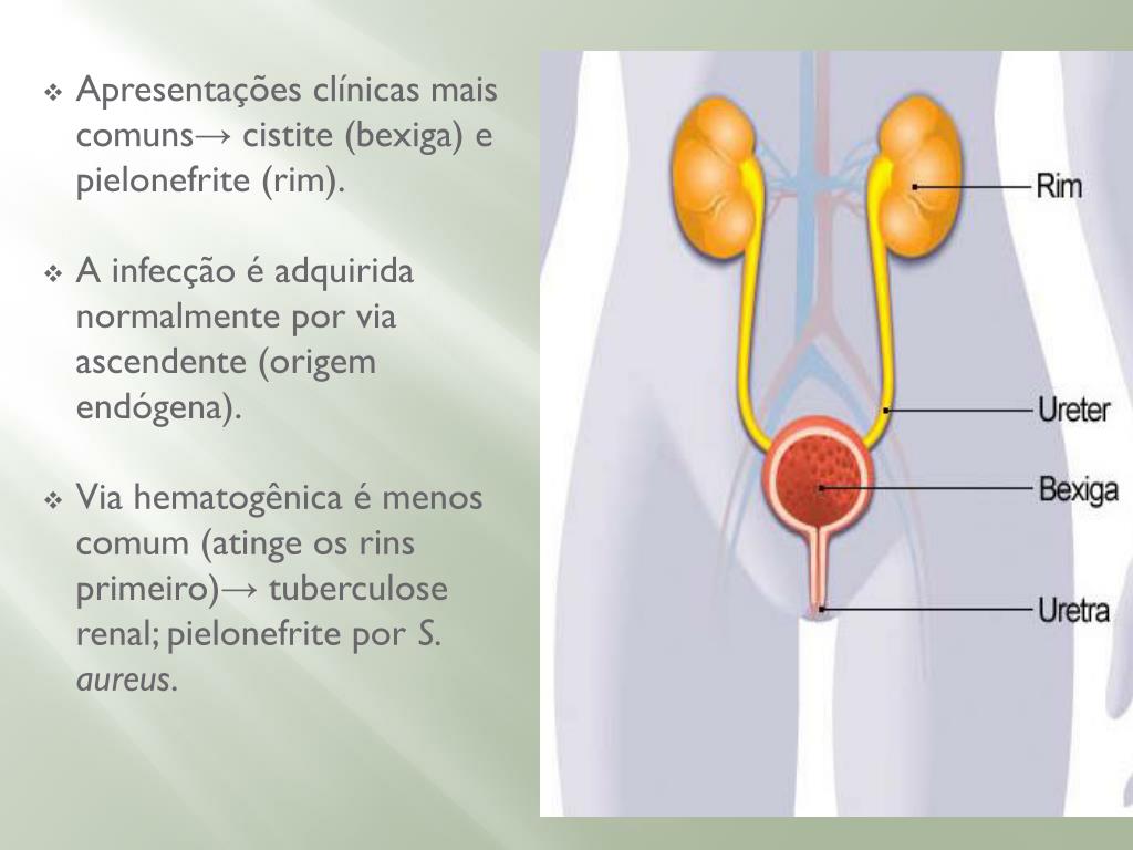 Apresentações clínicas mais comuns→ cistite (bexiga) e pielonefrite (rim). • A infecção é adquirida normalmente por via ascendente (origem endógena). • Via hematogênica é menos comum (atinge os rins primeiro)→ tuberculose renal; pielonefrite por S. aureus.