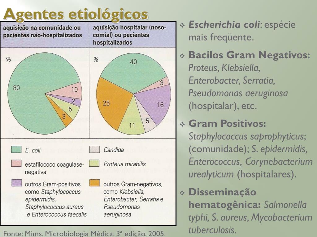 Agentes etiológicos • Escherichia coli: espécie mais freqüente. • Bacilos Gram Negativos:Proteus, Klebsiella, Enterobacter, Serratia, Pseudomonas aeruginosa (hospitalar), etc. • Gram Positivos:Staphylococcus saprophyticus; (comunidade); S. epidermidis, Enterococcus,Corynebacterium urealyticum (hospitalares). • Disseminação hematogênica:Salmonella typhi, S. aureus, Mycobacterium tuberculosis. Fonte: Mims. Microbiologia Médica. 3ª edição, 2005.