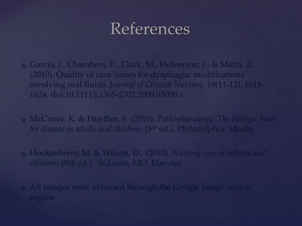 Garcia, J., Chambers, E., Clark, M., Helverson, J., & Matta, Z. (2010). Quality of care issues for dysphagia: modifications involving oral fluids. Journal of Clinical Nursing, 19(11-12), 1618-1624. doi:10.1111/j.1365-2702.2009.03009.x • McCance, K. & Huether, S. (2010). Pathophysiology: The biologic basis for disease in adults and children. (5th ed.). Philadelphia: Mosby. • Hockenberry, M. & Wilson, D., (2010). Nursing care of infants and children, (9th ed.) . St.Louis, MO. Elsevier. • All images were obtained through the Google Image search engine. References