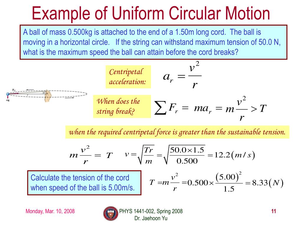 Example of Uniform Circular Motion A ball of mass 0.500kg is attached to the end of a 1.50m long cord. The ball is moving in a horizontal circle. If the string can withstand maximum tension of 50.0 N, what is the maximum speed the ball can attain before the cord breaks? Centripetal acceleration: When does the string break? when the required centripetal force is greater than the sustainable tension. Calculate the tension of the cord when speed of the ball is 5.00m/s. PHYS 1441-002, Spring 2008 Dr. Jaehoon Yu