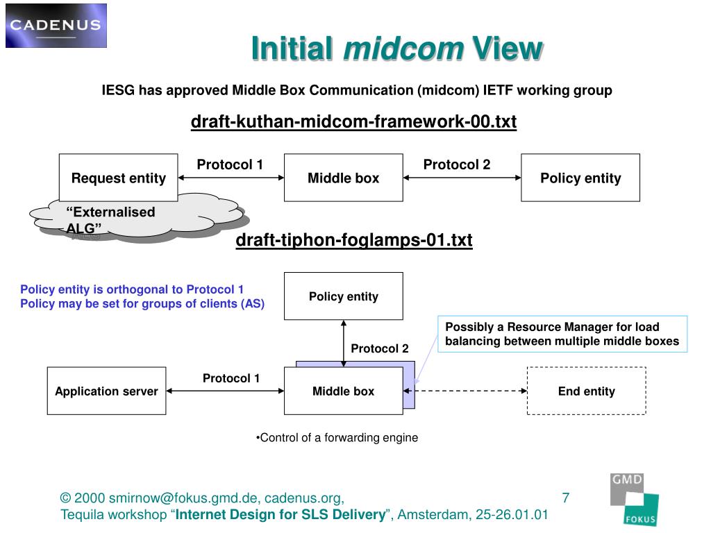 Initial midcom View IESG has approved Middle Box Communication (midcom) IETF working group draft-kuthan-midcom-framework-00.txt Protocol 1 Protocol 2 Request entity Middle box Policy entity “Externalised ALG” draft-tiphon-foglamps-01.txt Policy entity Policy entity is orthogonal to Protocol 1 Policy may be set for groups of clients (AS) Possibly a Resource Manager for load balancing between multiple middle boxes Protocol 2 Middle box Application server Protocol 1 Middle box End entity • Control of a forwarding engine