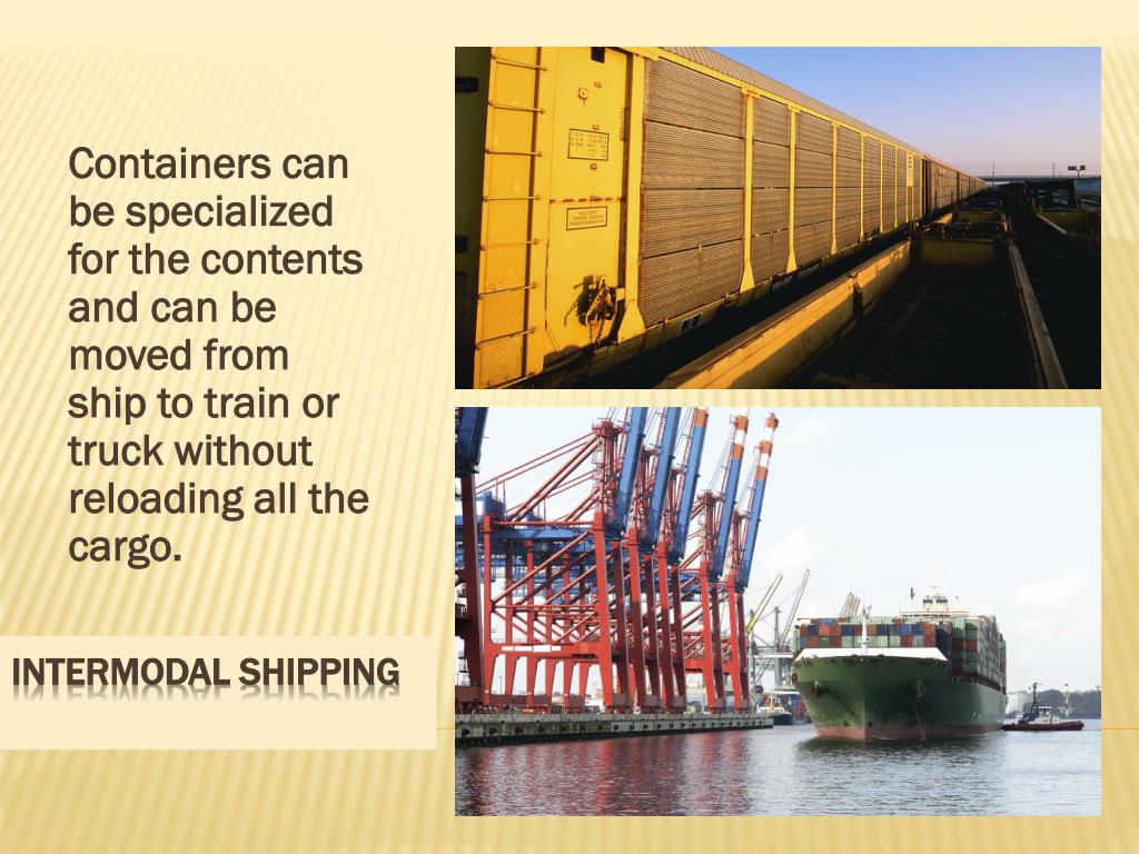 Containers can be specialized for the contents and can be moved from ship to train or truck without reloading all the cargo. INTERMODAL SHIPPING