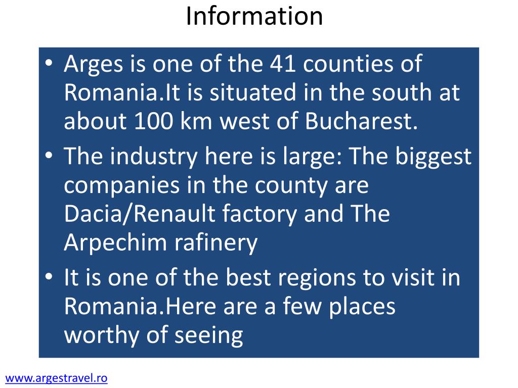 Information • Arges is one of the 41 counties of Romania.It is situated in the south at about 100 km west of Bucharest. • The industry here is large: The biggest companies in the county are Dacia/Renault factory and The Arpechimrafinery • It is one of the best regions to visit in Romania.Here are a few places worthy of seeing www.argestravel.ro