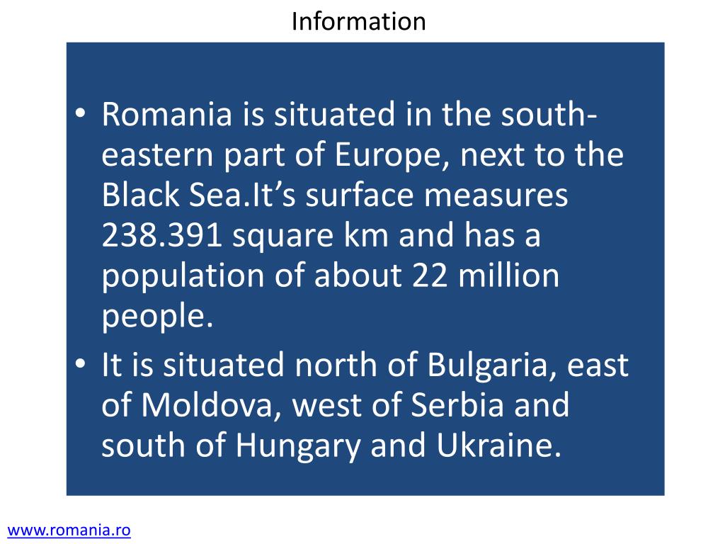Information • Romania is situated in the south-eastern part of Europe, next to the Black Sea.It’s surface measures 238.391 square km and has a population of about 22 million people. • It is situated north of Bulgaria, east of Moldova, west of Serbia and south of Hungary and Ukraine. www.romania.ro