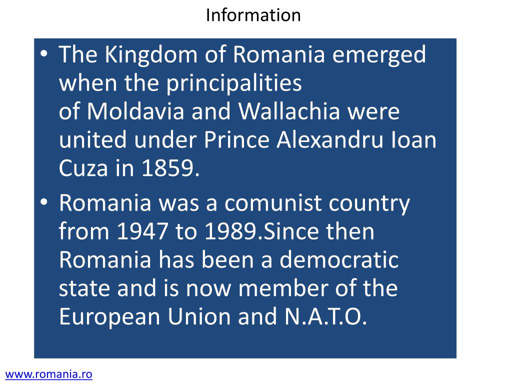 Information • The Kingdom of Romania emerged when the principalities of Moldavia and Wallachia were united under Prince AlexandruIoanCuza in 1859. • Romania was a comunist country from 1947 to 1989.Since then Romania has been a democratic state and is now member of the European Union and N.A.T.O. www.romania.ro