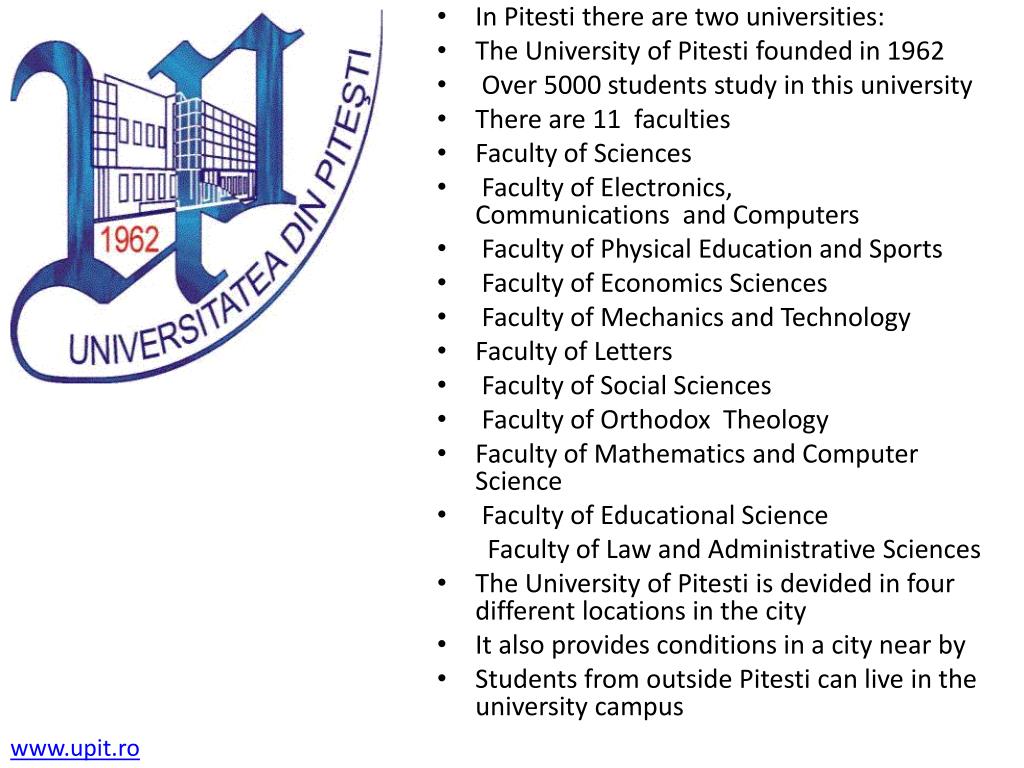 In Pitesti there are two universities: • The University of Pitesti founded in 1962 • Over 5000 students study in this university • There are 11 faculties • Faculty of Sciences • Faculty of Electronics, Communications and Computers • Faculty of Physical Education and Sports • Faculty of Economics Sciences • Faculty of Mechanics and Technology • Faculty of Letters • Faculty of Social Sciences • Faculty of Orthodox Theology • Faculty of Mathematics and Computer Science • Faculty of Educational Science Faculty of Law and Administrative Sciences • The University of Pitesti is devided in four different locations in the city • It also provides conditions in a city near by • Students from outside Pitesti can live in the university campus www.upit.ro
