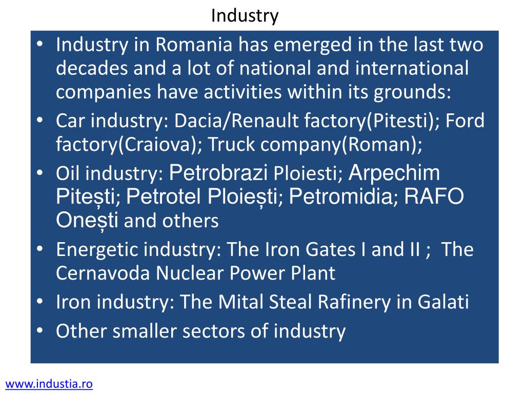 Industry • Industry in Romania has emerged in the last two decades and a lot of national and international companies have activities within its grounds: • Car industry: Dacia/Renault factory(Pitesti); Ford factory(Craiova); Truck company(Roman); • Oil industry: Petrobrazi Ploiesti; Arpechim Pitești; Petrotel Ploiești; Petromidia; RAFO Onești and others • Energetic industry: The Iron Gates I and II ; The Cernavoda Nuclear Power Plant • Iron industry: The Mital Steal Rafinery in Galati • Other smaller sectors of industry www.industia.ro
