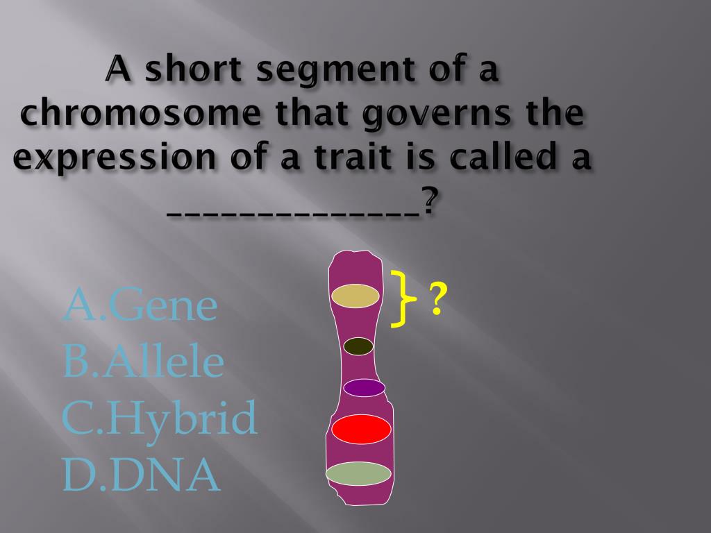 A short segment of a chromosome that governs the expression of a trait is called a ______________? ? • Gene • Allele • Hybrid • DNA