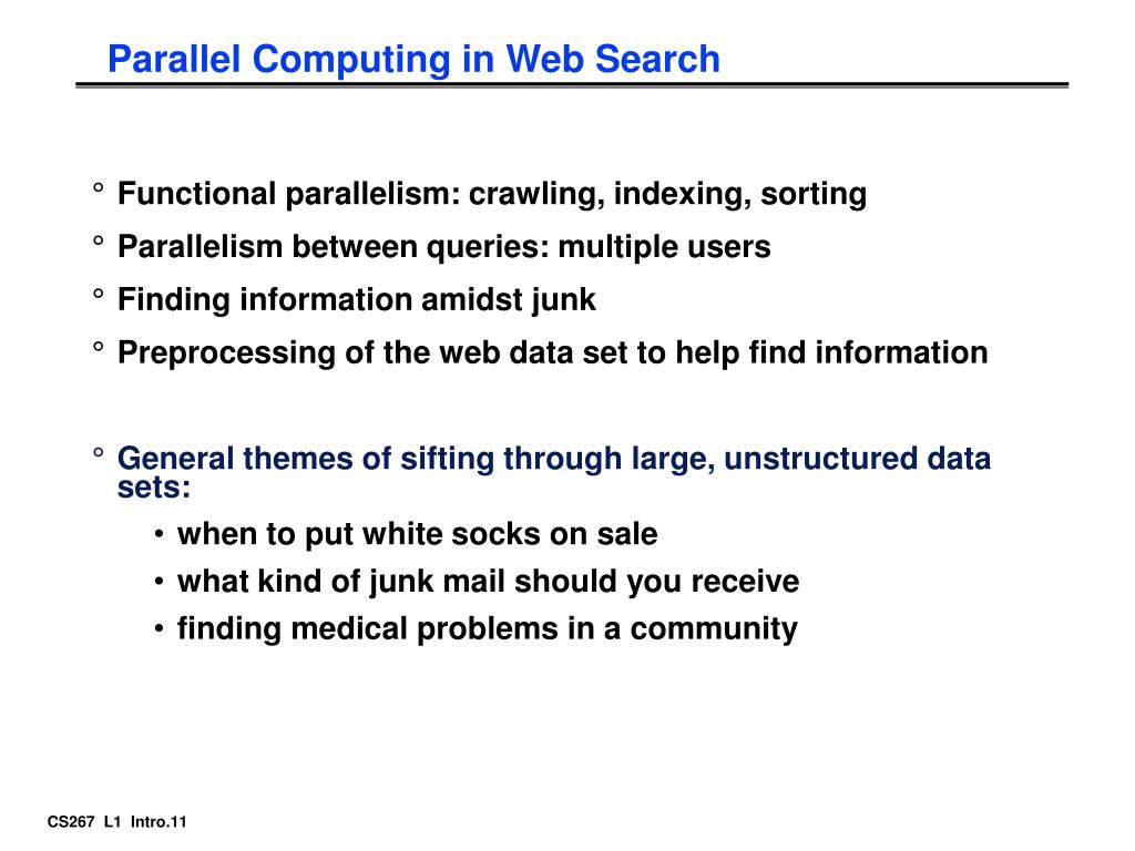 Parallel Computing in Web Search • Functional parallelism: crawling, indexing, sorting • Parallelism between queries: multiple users • Finding information amidst junk • Preprocessing of the web data set to help find information • General themes of sifting through large, unstructured data sets: • when to put white socks on sale • what kind of junk mail should you receive • finding medical problems in a community