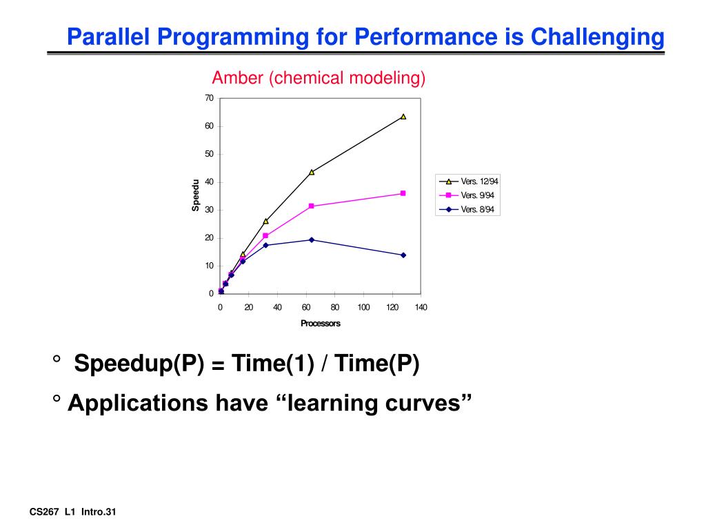 Parallel Programming for Performance is Challenging Amber (chemical modeling) • Speedup(P) = Time(1) / Time(P) • Applications have “learning curves”