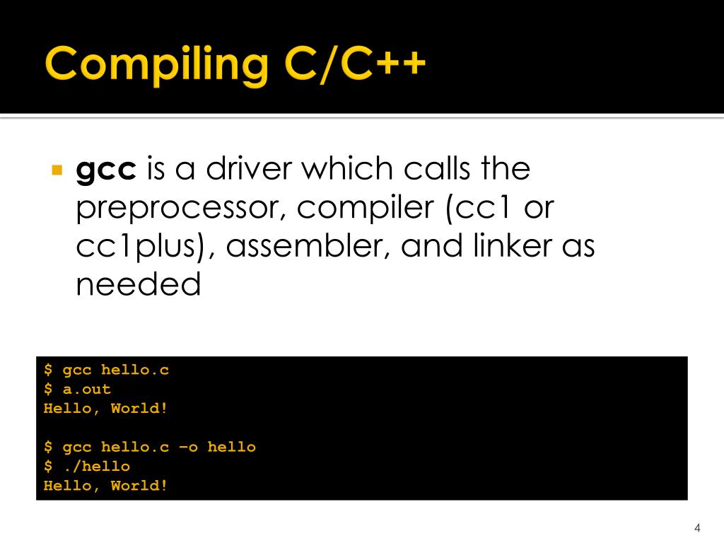 Compiling C/C++ • gcc is a driver which calls the preprocessor, compiler (cc1 or cc1plus), assembler, and linker as needed $ gcchello.c $ a.out Hello, World! $ gcchello.c –o hello $ ./hello Hello, World!