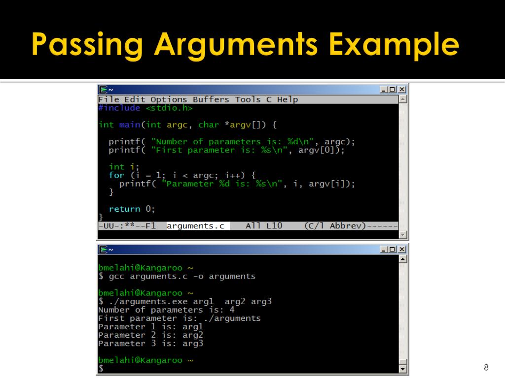 Main Arguments int main(intargc, char *argv[]) • argc: number of arguments passed to the program • argv: array of strings showing command line arguments • Name of executable + space-separated arguments • Name of executable is stored in argv[0] • The return value is int • convention: 0 means success, > 0 some error