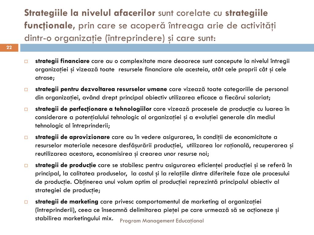 Strategiile la nivelul afacerilor sunt corelate cu strategiile funcţionale, prin care se acoperă întreaga arie de activităţi dintr-o organizaţie (întreprindere) şi care sunt: • strategii financiare care au o complexitate mare deoarece sunt concepute la nivelul întregii organizaţiei şi vizează toate resursele financiare ale acesteia, atât cele proprii cât şi cele atrase; • strategii pentru dezvoltarea resurselor umane care vizează toate categoriile de personal din organizaţiei, având drept principal obiectiv utilizarea eficace a fiecărui salariat; • strategii de perfecţionare a tehnologiilor care vizează procesele de producţie cu luarea în considerare a potenţialului tehnologic al organizaţiei şi a evoluţiei generale din mediul tehnologic al întreprinderii; • strategii de aprovizionare care au în vedere asigurarea, în condiţii de economicitate a resurselor materiale necesare desfăşurării producţiei, utilizarea lor raţională, recuperarea şi reutilizarea acestora, economisirea şi crearea unor resurse noi; • strategii de producţie care se stabilesc pentru asigurarea eficienţei producţiei şi se referă în principal, la calitatea produselor, la costul şi la relaţiile dintre diferitele faze ale procesului de producţie. Obţinerea unui volum optim al producţiei reprezintă principalul obiectiv al strategiei de producţie; • strategii de marketing care privesc comportamentul de marketing al organizaţiei (întreprinderii), ceea ce înseamnă delimitarea pieţei pe care urmează să se acţioneze şi stabilirea marketingului mix. Program Management Educaţional